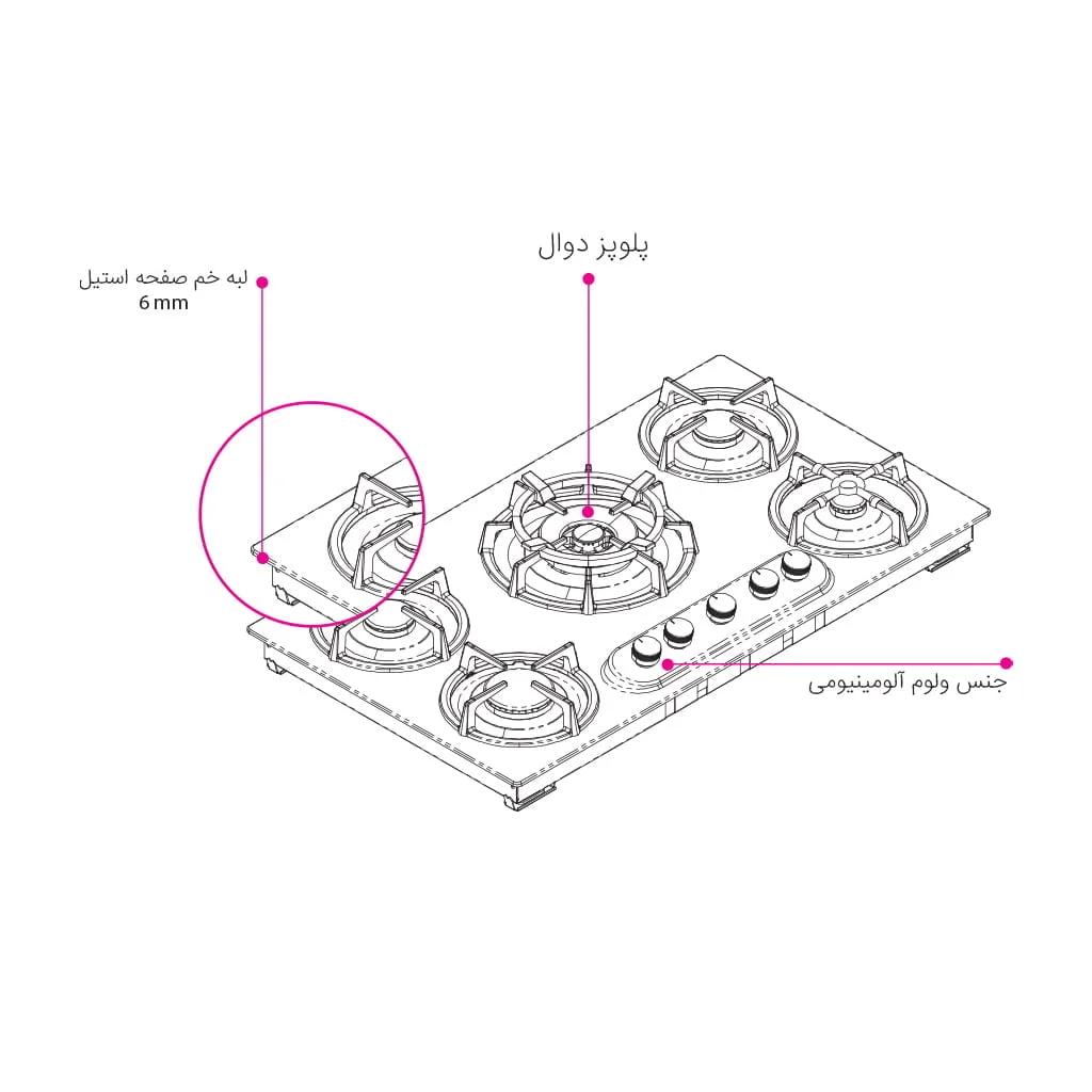 نوع گاز صفحه ایپنج شعلهابعاد51×89 سانتیمترطول گاز89 سانتیمترتعداد شعلهپنج شعلهمحدوده سایزاز 61 تا 85رنگاستیل